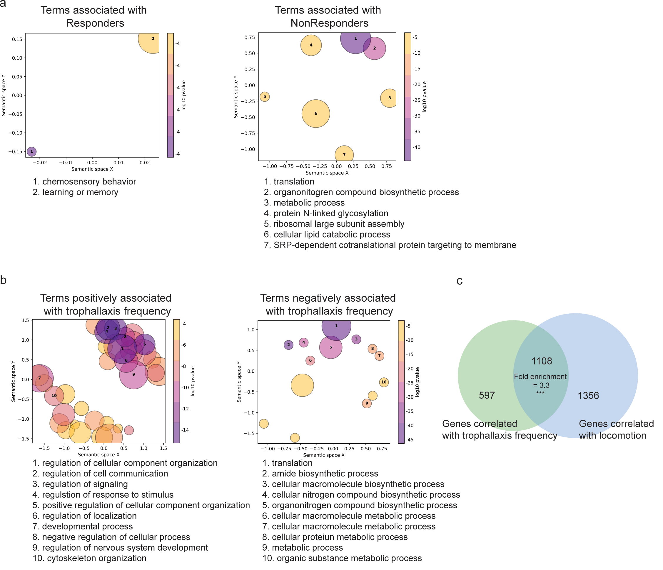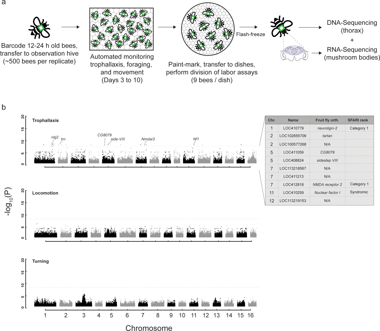 Область научных интересов: молекулярная биология, социобиология, апиология. Общительность В новой работе исследователи из США и Великобритании предположили, что более общительные пчёлы чаще занимаются трофаллаксисом и определили генетические и молекулярные механизмы общительности, основанной на трофаллаксисе, с помощью секвенирования генома, транскриптомики мозга и автоматизированного отслеживания поведения. Полногеномное исследование ассоциаций (GWAS) выявило 18 однонуклеотидных полиморфизмов (SNP), связанных с различиями в общительности (Рис. 1). Более половины выявленных однонуклеотидных полиморфизмов были локализованы в интронных областях генов. Несколько SNP были локализованы в генах, которые ранее связывали с общительностью у других видов, в том числе в контексте аутизма у людей, что указывает на общие молекулярные механизмы. Различия в общительности также были связаны с разной экспрессией генов в мозге, особенно генов, связанных с передачей нервных сигналов и развитием (Рис.2). Используя сравнительный геномный и транскриптомный подходы, были обнаружены свидетельства различий в механизмах, лежащих в основе общительности у разных особей, в том числе в механизмах, связанных с чувствительностью к вознаграждению и вероятностью встречи. Эти результаты указывают на возможное эволюционное сохранение молекулярных основ общительности. Исследования социальных насекомых показали, что различия в последовательности генов и профиле их экспрессии свидетельствуют о некоторой степени сходства между позвоночными и беспозвоночными в нейрогеномной архитектуре социального поведения, несмотря на то что они разошлись около 600 миллионов лет назад [1]. Рис. 1. Схема эксперимента и геномные корреляты частоты трофаллаксиса у пчёл. (a) Для каждого эксперимента около 500 пчёл из двух исходных колоний маркировались баркодами и помещалась на сот для автоматического мониторинга трофаллаксиса, поиска пищи и перемещения. Через 10 дней пчёл помещали в чашку Петри и подвергали тестам на агрессию и миролюбие. Сразу после поведенческих тестов пчёл замораживали и хранили до вскрытия грудной части и мозга для секвенирования ДНК и РНК соответственно. Окончательный размер выборки для полногеномного секвенирования и секвенирования РНК грибовидных тел мозга составил 357 и 176 соответственно, при этом в двух повторных испытаниях использовались три исходные колонии. (b) (Верхняя диаграмма) полногеномное исследование ассоциаций (GWAS) выявило 18 однонуклеотидных полиморфизмов (SNP), которые в значительной степени связаны с различиями в частоте трофаллаксиса, 12 из которых локализованы в интронах. У позвоночных животных наблюдаются различия в экспрессии или структуре трёх из этих генов: нейролигин-2, NMDA-рецептор 2 и Ядерный фактор I, связанные с аутизмом согласно базе данных SFARI. (Центральная и нижняя диаграмма) не выявлено каких-либо SNP, связанных с изменением локомоции, которая способствует трофаллаксису. Рис. 2. Нейромолекулярные корреляты частоты трофаллаксиса и социальной активности в грибовидных телах мозга медоносных пчёл. (а) Анализ с помощью онтологии генов выявил группы генов, связанные с хеморецепцией и обучением, которые были активированными у общительных пчел, в то время как гены, связанные с метаболическими процессами, были активированными у 