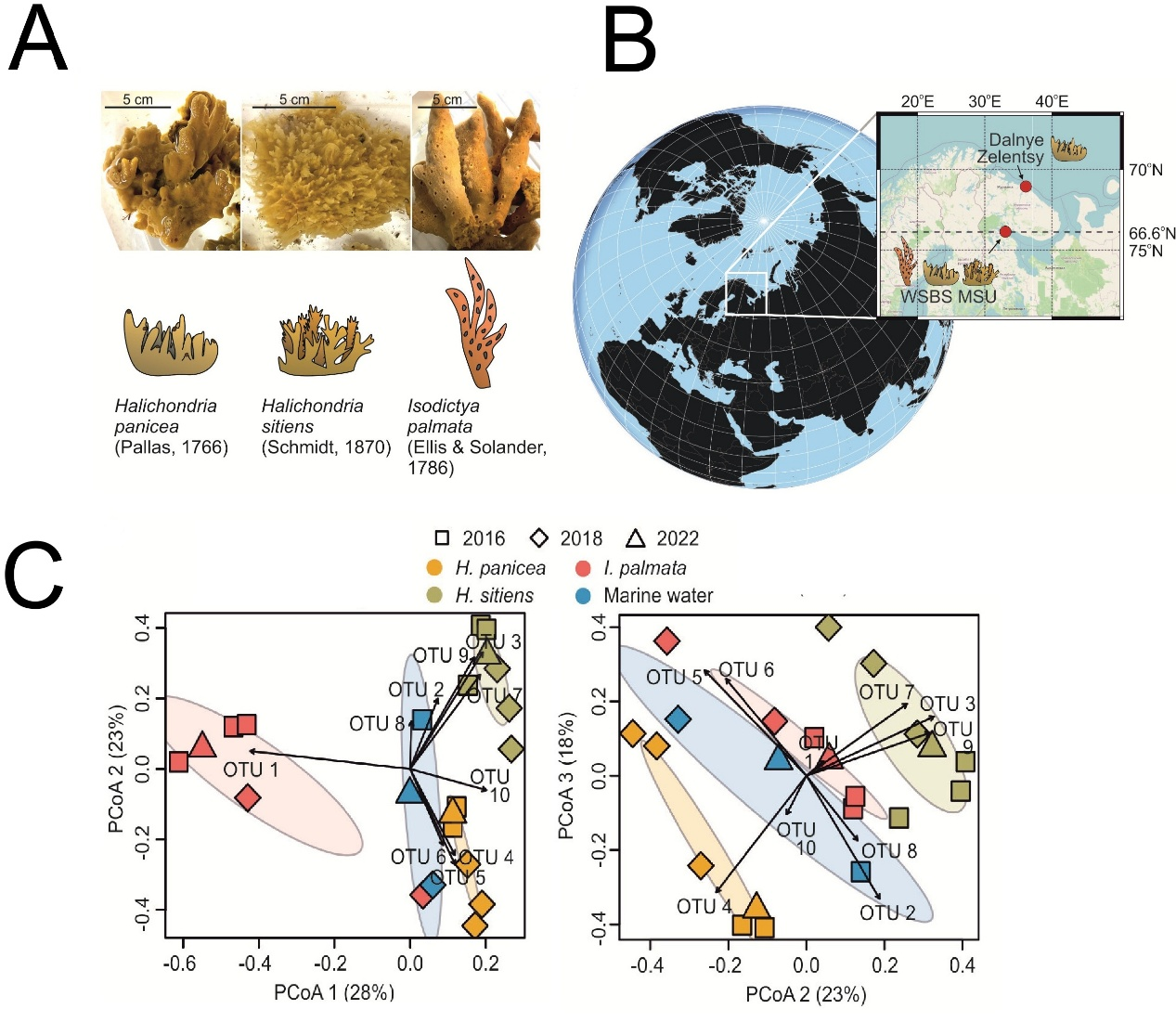 соискатель ИБР РАН им. Н.К.Кольцова. Научные интересы: микробиология, биоинформатика. Морские губки являются одними из самых древних многоклеточных организмов и представляют собой один из первых примеров симбиоза между животными и бактериями. Бактерии, археи, эукариоты и вирусы вместе с губкой образуют холобионт — единую функциональную систему, в которой каждый участник вносит свой вклад в стабильность и гомеостаз организма [1]. Бактериальные симбионты играют важную роль в защите хозяина от патогенов, обеспечении его витаминами, аминокислотами и другими метаболитами, а также участвуют в регуляции циклов азота и серы [2]. Благодаря этому губки способны обитать в крайне бедных питательными веществами водах, где они формируют устойчивые микроэкосистемы. Изучение симбиоза губок с микроорганизмами помогает не только понять ранние этапы эволюции многоклеточных животных, но и выявить новые метаболические пути, потенциально значимые для биотехнологии. Методы высокопроизводительного секвенирования (NGS) позволили исследовать эти ассоциации у организмов, обитающих в экстремальных условиях, таких как арктические моря, где температура воды и доступность органического вещества ограничивают большинство форм жизни. Несмотря на растущий интерес, многие виды полярных губок остаются слабо охарактеризованными, а механизмы формирования их микробных сообществ и функциональной специализации до сих пор изучены недостаточно. Наша работа охватывает данные за шесть лет наблюдений (2016, 2018 и 2022 годы) и демонстрирует уникальную таксономическую организацию ассоциированных микробных сообществ трёх симпатрических холодноводных губок — Halichondria panicea, Halichondria sitiens и Isodictya palmata, обитающих Кандалакшском заливе Белого моря. Микробиомы двух последних видов были описаны впервые. Основные результаты исследования Все три вида губок обладали видоспецифичными микробными сообществами, даже несмотря на совместное обитание в одном арктическом биотопе. Симбионты относились преимущественно к классам Alphaproteobacteria и Gammaproteobacteria. Таким образом, каждая губка имела уникальный «микробный паспорт», отражающий особенности её физиологии и, вероятно, эволюционной истории (Рисунок 1). Рисунок 1. А - Репрезентативные изображения трёх изученных видов губок. Масштабная линейка составляет 5 см. Под соответствующими изображениями показаны графические значки, иллюстрирующие виды губок. B - Карта мест сбора образцов. С - Анализ главных координат (PCoA) различий по Брэй–Кёртису между микробиомами губок и морской воды Белого моря. Несмотря на таксономические различия, функциональный потенциал микробиомов оказался сходным. Все три сообщества кодировали гены, участвующие в биосинтезе аминокислот, витаминов и кофакторов, а также транспортных систем, обеспечивающих их доставку хозяину. Симбионты также обладали потенциалом к деградации сложных органических соединений, что позволяет рассматривать их как ключевых участников переработки органического вещества в арктических экосистемах. Эти данные подтверждают идею функциональной конвергенции симбионтов: разные бактериальные таксоны способны обеспечивать сходные метаболические функции в рамках одного экологического контекста. При этом на уровне отдельных симбионтов выявлены различия в составе эукариот-подобных белков 